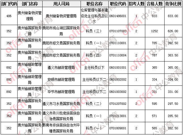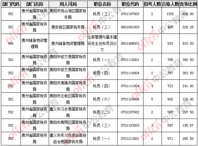 報(bào)名通過(guò)審核人數(shù)較多的職位主要集中在貴州省國(guó)家稅務(wù)局、貴州儲(chǔ)備物資管理局兩大部門,具體信息如下: