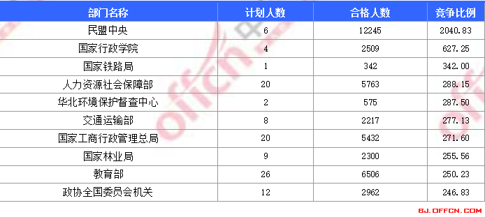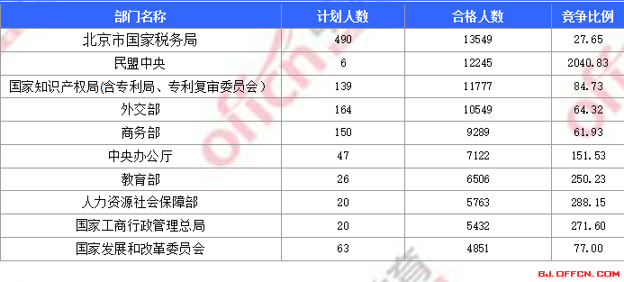 為幫助廣大考生更清晰的了解今日?qǐng)?bào)名情況,中公網(wǎng)校中公教育整理了合格人數(shù)前十位的部門以及競(jìng)爭(zhēng)比例最激烈的十大部門,供廣大考生參考: