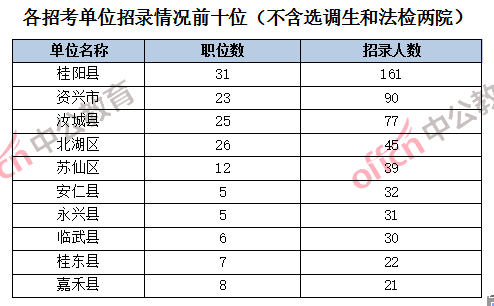 從招錄單位人數(shù)前十來看,桂陽縣招錄人數(shù)最多,占招錄總人數(shù)的29.38%;其次為資興市,招錄人數(shù)占16.42%。