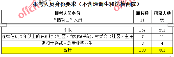本次招錄有88.83%的職位不限招考對象,其余職位對報考人員的身份要求劃分得非常細致。““四項目”人員、“連續(xù)任職3年以上的在職村(社區(qū))黨組織書記、村委會(社區(qū))主任”均占一席之地。中公教育專家提醒大家一定要看清楚自己的身份是否符合所選職位。