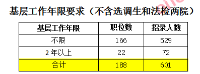 湖南省對基層工作經(jīng)歷要求寬泛,本次招錄共有88.02%職位對基層工作經(jīng)歷無限制,招錄人數(shù)高達88.30%,應屆生機會多多。要求2年以上基層工作經(jīng)歷的招錄人數(shù)占11.70%。