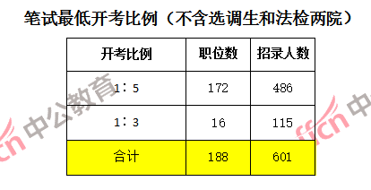 筆試最低開考比例1:5的招錄人數(shù)最多,占總人數(shù)的80.87%。一般職位筆試最低開考比例為1∶5。具體筆試最低開考比例以招考職位表為準。