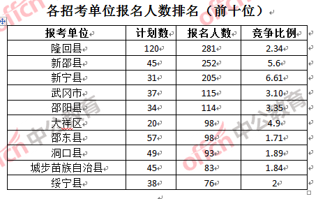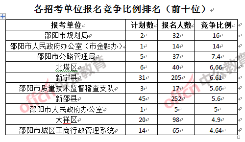 為幫助廣大考生更清晰的了解報(bào)名情況,中公教育整理了邵陽各招考單位的報(bào)名人數(shù)排名以及競爭比例排名,供廣大考生參考: