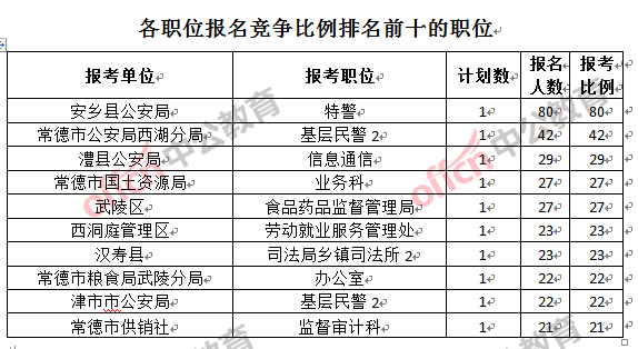 競爭熱門職位,前三位依次是:安鄉(xiāng)縣公安局特警(競爭比例80:1)、常德市公安局西湖分局基層民警2(競爭比例42:1)和澧縣公安局信息通信(競爭比例29:1)。