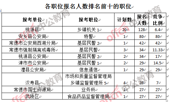 為幫助廣大考生更清晰的了解報名情況,中公教育整理了常德市各職位的報名人數(shù)排名以及競爭比例排名,供廣大考生參考: