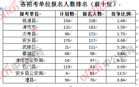 競爭熱門招考單位,前三位依次是:常德市公安局西湖分局(競爭比例28.5:1)、常德市國土資源局(競爭比例27:1)和安鄉(xiāng)縣公安局(競爭比例13.5:1)。
