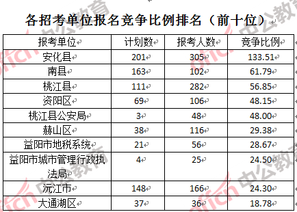 競(jìng)爭(zhēng)熱門(mén)招考單位,前三位依次是:安化縣 (競(jìng)爭(zhēng)比例133.5:1)、南縣(競(jìng)爭(zhēng)比例61.3:1)和桃江縣(競(jìng)爭(zhēng)比例56.8:1)。