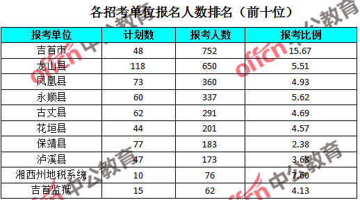 競爭熱門招考單位,前三位依次是:保靖縣州公安局碗米坡分局(競爭比例25:1)、吉首市(競爭比例15.67:1)和鳳凰縣法院(競爭比例12.5:1)。