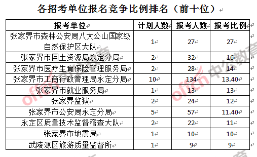 競(jìng)爭(zhēng)熱門招考單位,前三位依次是:張家界市森林公安局八大公山自然保護(hù)區(qū)大隊(duì)(競(jìng)爭(zhēng)比例27:1)、張家界市國(guó)土資源局永定分局(競(jìng)爭(zhēng)比例16:1)和張家界市醫(yī)療生育保險(xiǎn)管理服務(wù)局(競(jìng)爭(zhēng)比例14:1)。