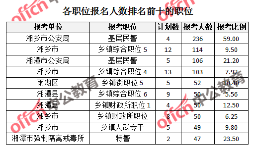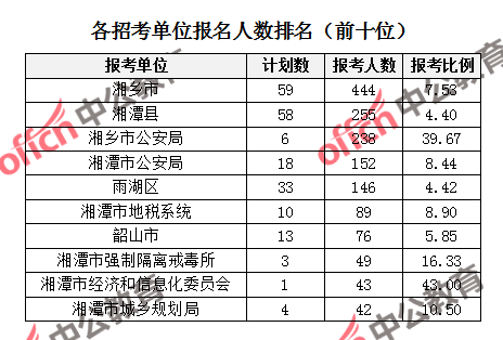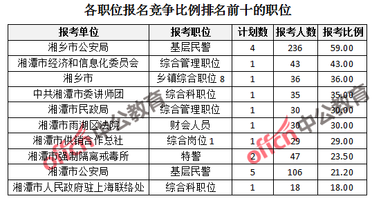 為幫助廣大考生更清晰的了解報(bào)名情況,中公教育整理了湘潭市各招考單位的報(bào)名人數(shù)排名以及競爭比例排名,供廣大考生參考:
