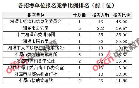 競爭熱門招考單位,前三位依次是:湘潭市經(jīng)濟(jì)和信息化委員會(huì)(競爭比例43:1)、湘鄉(xiāng)市公安局(競爭比例39.67:1)、中共湘潭市委團(tuán)(競爭比例35:1)。