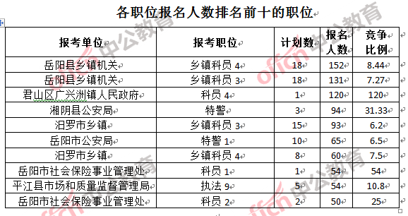 為幫助廣大考生更清晰的了解報名情況,中公教育整理了岳陽市各職位的報名人數(shù)排名以及競爭比例排名,供廣大考生參考: