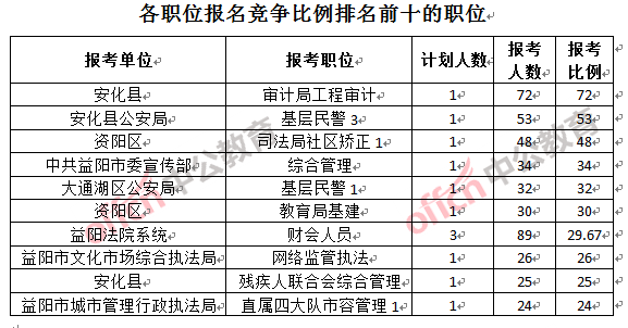 競爭最熱門職位,前三位依次是:安化縣審計(jì)局工程審計(jì)(競爭比例72:1)、安化縣公安局基層民警3(競爭比例53:1)和資陽區(qū)司法局社區(qū)矯正1(競爭比例48:1)。