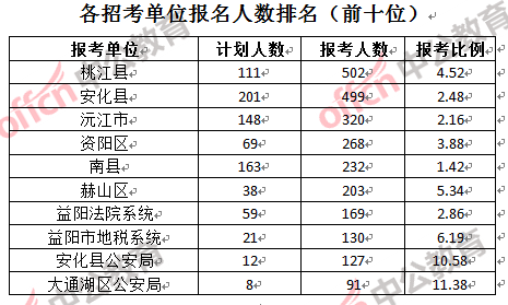 為幫助廣大考生更清晰的了解報(bào)名情況,中公教育整理了益陽市各招考單位的報(bào)名人數(shù)排名以及競爭比例排名,供廣大考生參考: