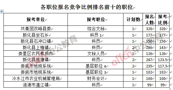 競爭熱門職位,前三位依次是:共青團雙峰縣委綜合文秘(競爭比例320:1)、新化縣坐石鄉(xiāng)科員1(競爭比例177:1)和新化縣石沖口鎮(zhèn)科員(競爭比例150:1)。