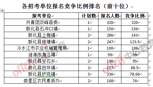 競(jìng)爭(zhēng)熱門招考單位,前三位依次是:共青團(tuán)雙峰縣委(競(jìng)爭(zhēng)比例320:1)、新化縣石沖口鎮(zhèn)(競(jìng)爭(zhēng)比例150:1)和新化縣上梅鎮(zhèn)(競(jìng)爭(zhēng)比例143:1)。