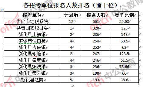 為幫助廣大考生更清晰的了解報(bào)名情況,中公網(wǎng)校整理了婁底市各招考單位的報(bào)名人數(shù)排名以及競(jìng)爭(zhēng)比例排名,供廣大考生參考: