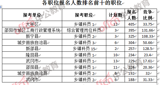 競爭熱門職位,前三位依次是:新寧縣鄉(xiāng)鎮(zhèn)科員10(競爭比例144:1)、邵陽市城區(qū)工商行政管理系統(tǒng)綜合管理崗位科員(競爭比例131.66:1)和新邵縣鄉(xiāng)鎮(zhèn)科員15(競爭比例128.5:1)。