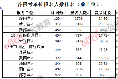 為幫助廣大考生更清晰的了解報名情況,中公網(wǎng)校整理了邵陽各招考單位的報名人數(shù)排名以及競爭比例排名,供廣大考生參考: