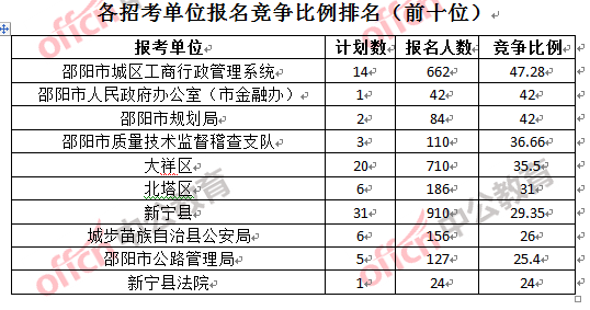 競爭熱門招考單位,前三位依次是:邵陽市城區(qū)工商行政管理系統(tǒng)(競爭比例47.28:1)、邵陽市人民政府辦公室(市金融辦)(競爭比例42:1)和邵陽市規(guī)劃局(競爭比例42:1)。