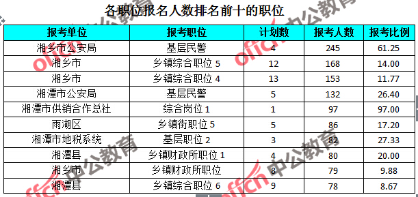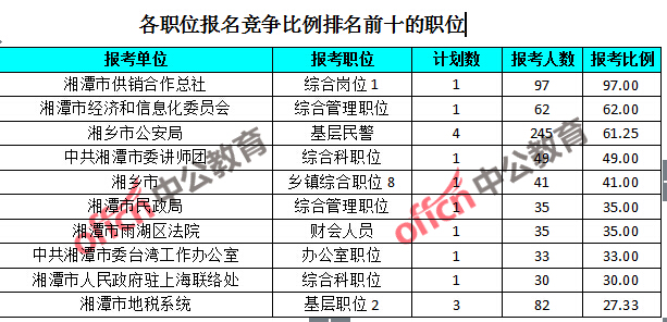 為幫助廣大考生更清晰的了解報名情況,中公網(wǎng)校整理了湘潭市各職位的報名人數(shù)排名以及競爭比例排名,供廣大考生參考: