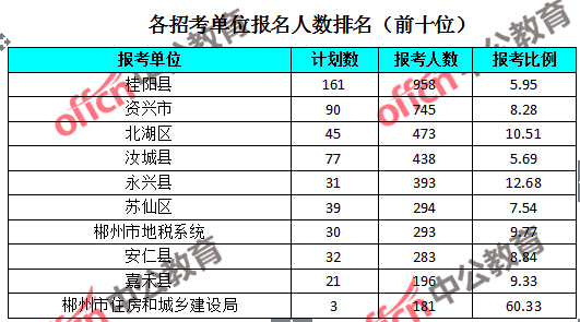為幫助廣大考生更清晰的了解報(bào)名情況,中公網(wǎng)校整理了湖南郴州各招考單位的報(bào)名人數(shù)排名以及競(jìng)爭(zhēng)比例排名,供廣大考生參考: