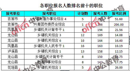 為幫助廣大考生更清晰的了解報(bào)名情況,中公網(wǎng)校整理了湖南湘西各職位的報(bào)名人數(shù)排名以及競(jìng)爭(zhēng)比例排名,供廣大考生參考: