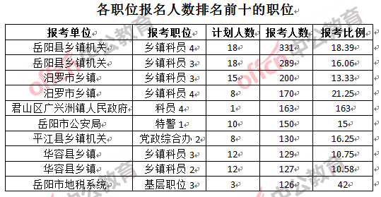 為幫助廣大考生更清晰的了解報名情況,中公網(wǎng)校整理了岳陽市各職位的報名人數(shù)排名以及競爭比例排名,供廣大考生參考: