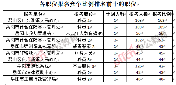 競爭最熱門職位,前三位依次是:君山區(qū)廣興洲鎮(zhèn)人民政府科員4(競爭比例163:1)、岳陽市社會保險事業(yè)管理處科員1(競爭比例109:1)和岳陽市救助管理站未成年人教育矯治(競爭比例56:1)。