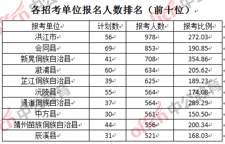 為幫助廣大考生更清晰的了解報名情況,中公網(wǎng)校整理了懷化市各招考單位的報名人數(shù)排名以及競爭比例排名,供廣大考生參考: