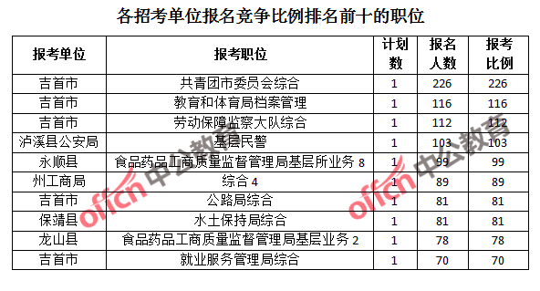 為幫助廣大考生更清晰的了解報(bào)名情況,中公網(wǎng)校整理了湘西州各職位的報(bào)名人數(shù)排名以及競(jìng)爭(zhēng)比例排名,供廣大考生參考: