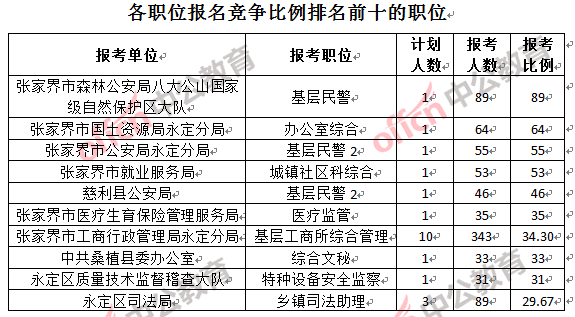 競(jìng)爭(zhēng)最熱門(mén)職位,前三依次是:張家界市森林公安局八大公山自然保護(hù)區(qū)大隊(duì)基層民警(競(jìng)爭(zhēng)比例89:1)、張家界市國(guó)土資源局永定分局辦公室綜合(競(jìng)爭(zhēng)比例64:1)和張家界市公安局永定分局基層民警2(競(jìng)爭(zhēng)比例55:1)。