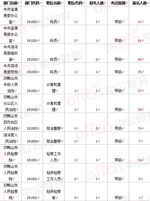 黑龍江中公教育為參加2014年黑龍江省公務(wù)員考試的考生整理截止至5月19日早9點(diǎn)的雙鴨山考區(qū)繳費(fèi)人數(shù),由于報(bào)名網(wǎng)站報(bào)名情況每30分鐘統(tǒng)計(jì)一次,數(shù)據(jù)可能會有細(xì)微差異,所有數(shù)據(jù)僅供大家參考。