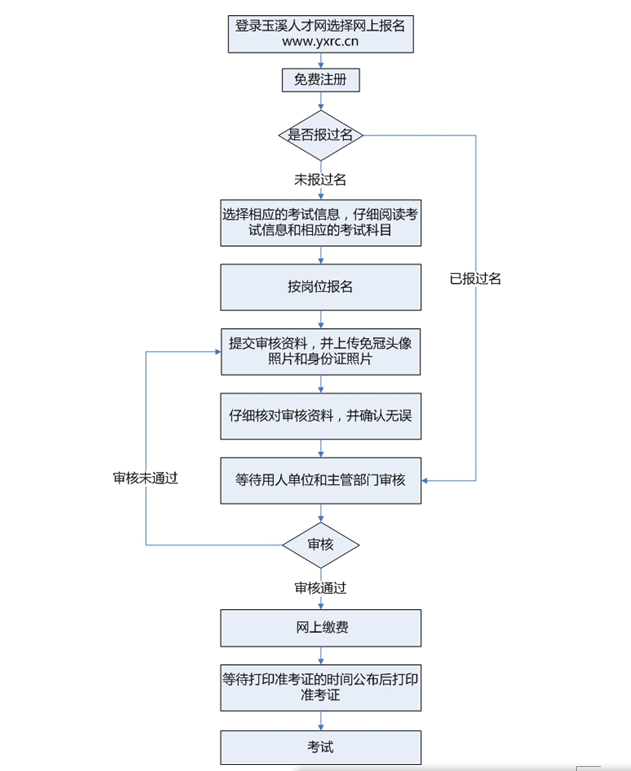 網(wǎng)絡(luò)報(bào)名的大致流程為:登錄玉溪人才網(wǎng)→網(wǎng)上報(bào)名入口→注冊(cè)→查看招聘崗位→按崗位報(bào)名并填寫報(bào)名資料→等待審核→審核通過→網(wǎng)上交費(fèi)(注意查看交費(fèi)狀態(tài),確認(rèn)交費(fèi))→打印筆試準(zhǔn)考證(打印時(shí)間在筆試公告內(nèi)另行通知)→參加筆試。