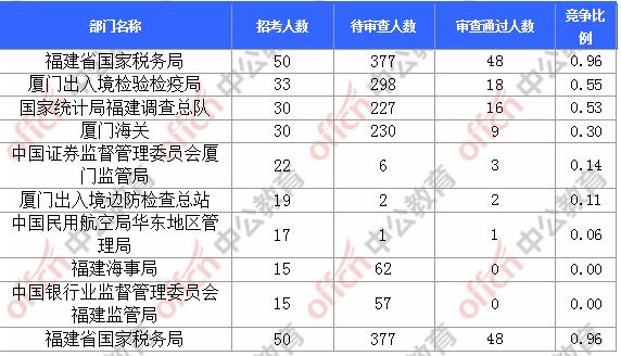 截止到30日18時(shí),通過審核人數(shù)前三位的部門依次是:福建省國(guó)家稅務(wù)局、廈門出入境檢驗(yàn)檢疫局、國(guó)家統(tǒng)計(jì)局福建調(diào)查總隊(duì),三部門通過審核總?cè)藬?shù)達(dá)82人,占通過審核總?cè)藬?shù)的84.53%。