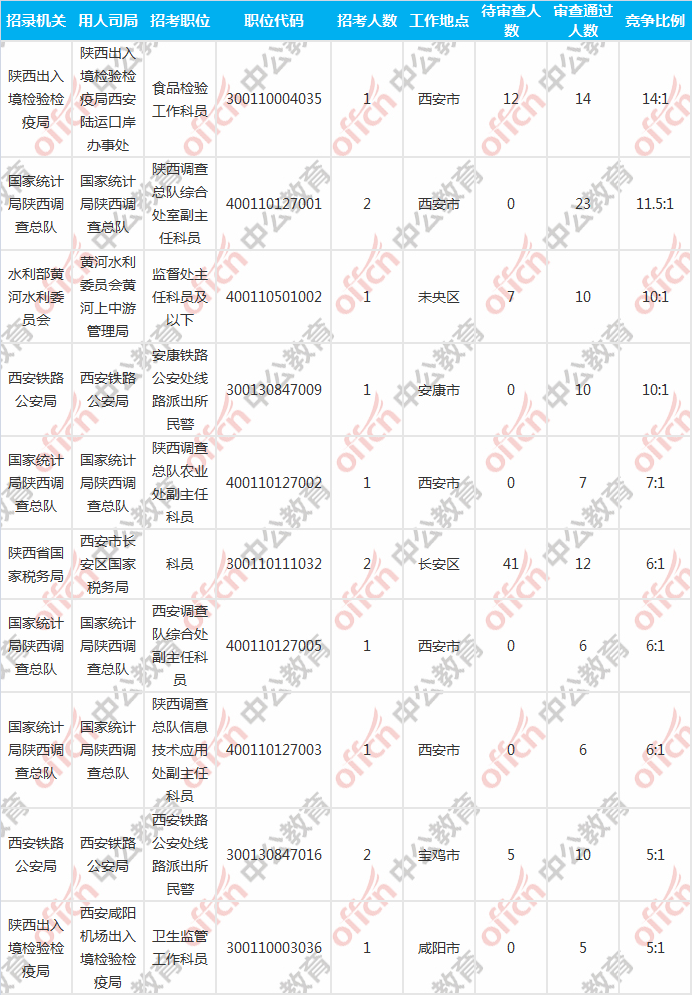 報名通過審核人數(shù)前十的職位主要集中在陜西出入境檢驗檢疫局、國家統(tǒng)計局陜西調(diào)查總隊、西安鐵路公安局等部門,具體信息如下: