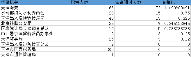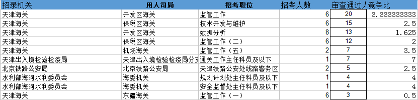 報名通過審核人數(shù)前十的職位主要集中在天津海關(guān)、水利部海河水利委員會等部門,具體信息如下: