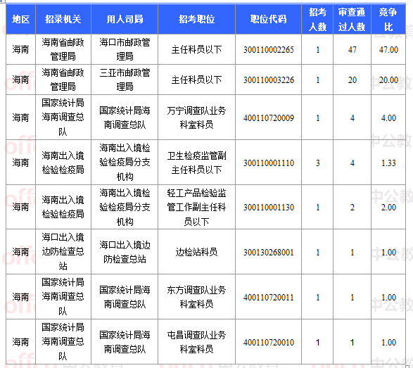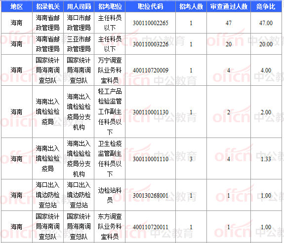 報名通過審核人數(shù)前十的職位主要集中在海南省郵政管理局、國家統(tǒng)計局海南調(diào)查總隊、海南出入境檢驗檢疫局等部門,具體信息如下: