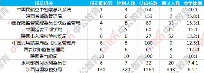 報名人數(shù)前十的職位主要集中在陜西省國家稅務局、中國民航空中警察總隊系統(tǒng)、中國保險監(jiān)督管理委員會陜西監(jiān)管局等部門,具體信息如下: