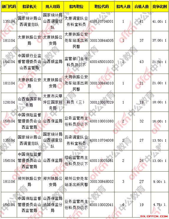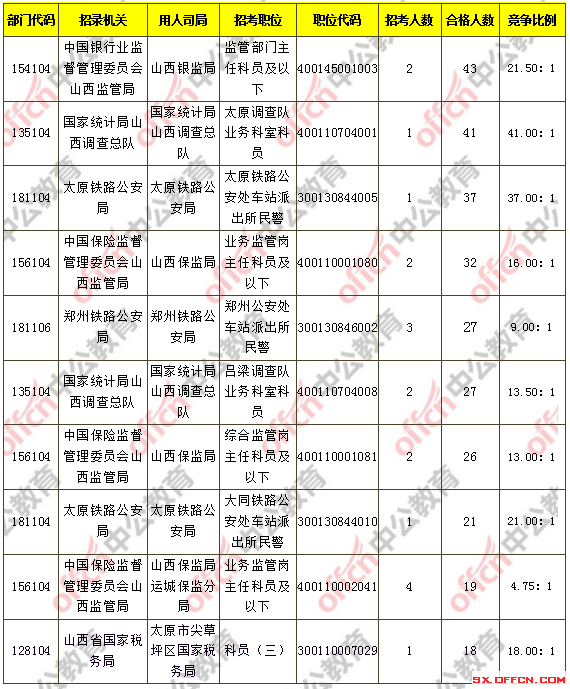 報名通過審核人數前十的職位主要集中在中國銀行業(yè)監(jiān)督管理委員會山西監(jiān)管局、國家統計局山西調查總隊、太原鐵路公安局等部門,具體信息如下: