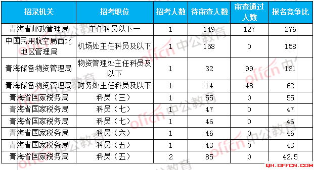 報(bào)名人數(shù)前十的職位主要集中在青海省郵政管理局、青海儲(chǔ)備物資管理局、青海省國(guó)家稅務(wù)局等部門(mén),具體信息如下: