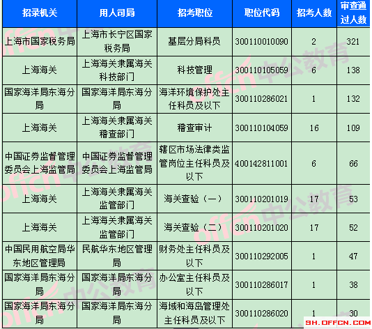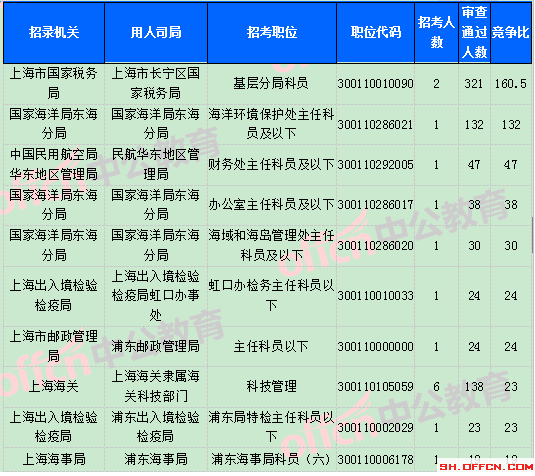 截止到31日18時,競爭比例的職位為上海市國家稅務局上海市長寧區(qū)國家稅務局基層分局科員一職,招錄2人,截止到31日18時通過人數(shù)為321人。報名通過審核人數(shù)前十的職位主要集中在上海市國家稅務局,上海海關(guān),國家海洋局東海分局等部門,具體信息如下: