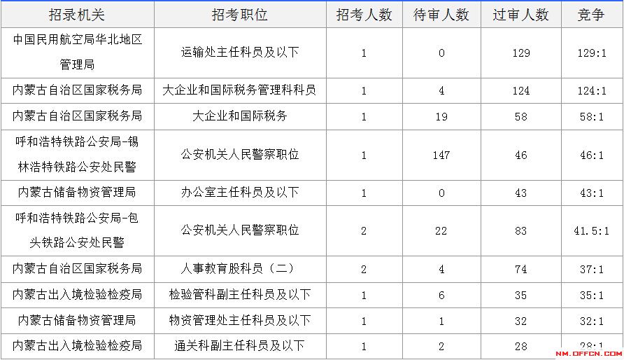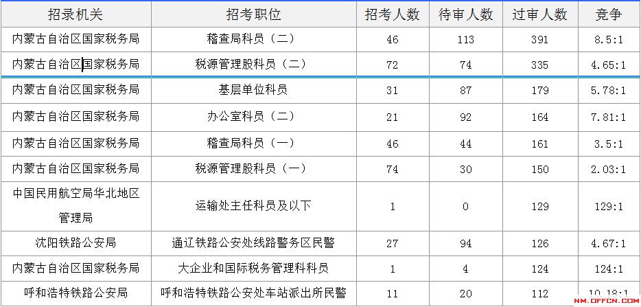 報(bào)名通過審核人數(shù)前十的職位主要集中在內(nèi)蒙古自治區(qū)國(guó)家稅務(wù)局,沈陽(yáng)鐵路局、呼和浩特鐵路局以及中國(guó)民用航空局華北地區(qū)管理局等部門,具體信息如下: