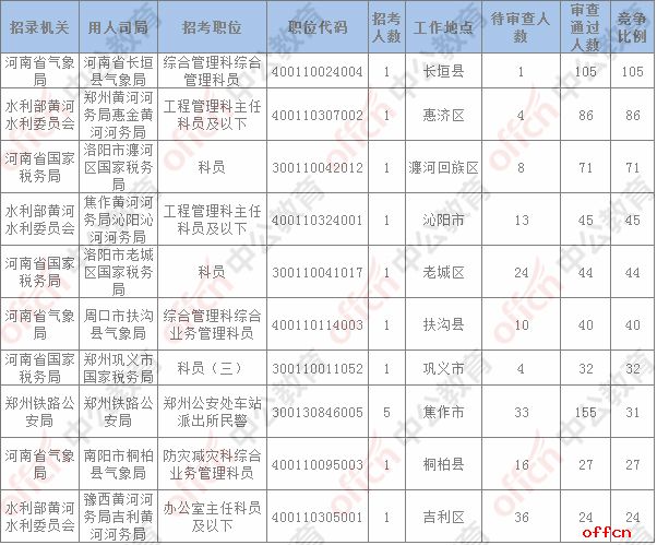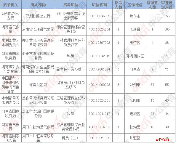 報(bào)名通過審核人數(shù)前十的職位主要集中在河南省國(guó)家稅務(wù)局、鄭州鐵路公安局、中國(guó)銀行業(yè)監(jiān)督管理委員會(huì)河南監(jiān)管局、水利部黃河水利委員會(huì)等部門,具體信息如下: