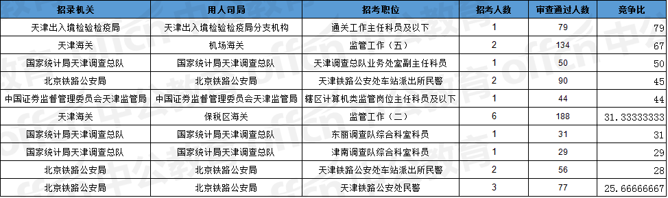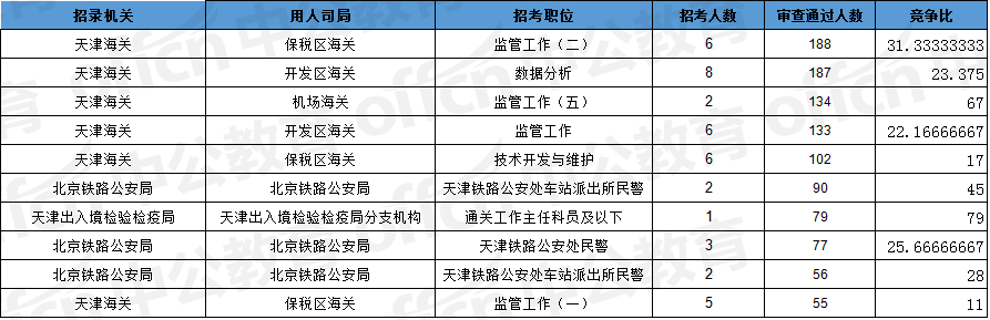 報(bào)名通過(guò)審核人數(shù)前十的職位主要集中在天津海關(guān)、北京鐵路公安局、天津出入境檢驗(yàn)檢疫局等部門(mén),具體信息如下: