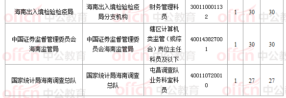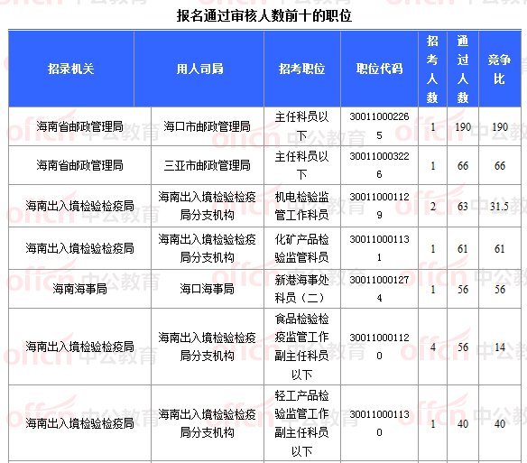報名通過審核人數(shù)前十的職位主要集中在海南省郵政管理局、海南出入境檢驗檢疫局、海南海事局等部門,具體信息如下: