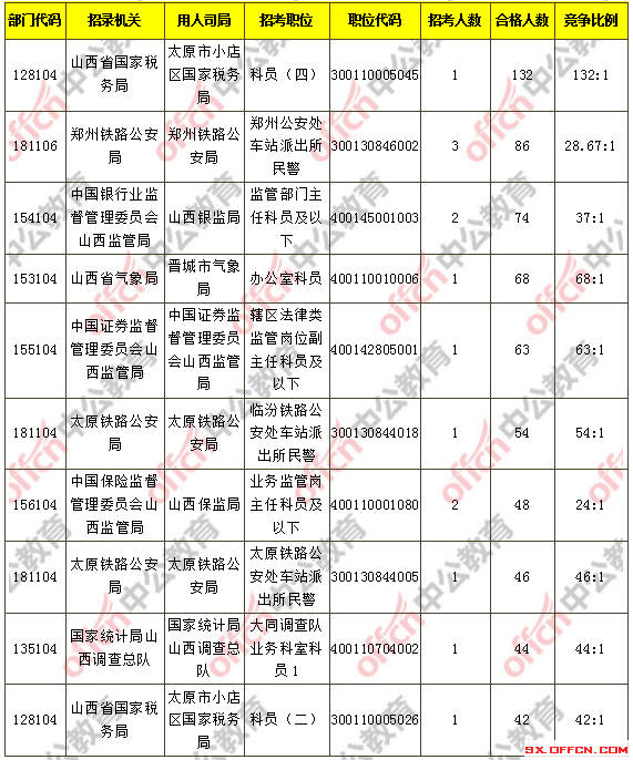 報(bào)名通過(guò)審核人數(shù)前十的職位主要集中在山西省國(guó)家稅務(wù)局、鄭州鐵路公安局、中國(guó)銀行業(yè)監(jiān)督管理委員會(huì)山西監(jiān)管局等部門,具體信息如下: