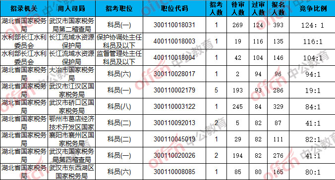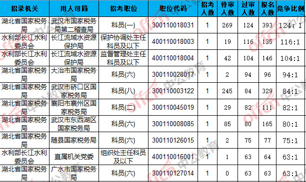 報名通過審核人數(shù)前十的職位主要集中在湖北省國家稅務(wù)局、水利部長江水利委員會等部門,具體信息如下: