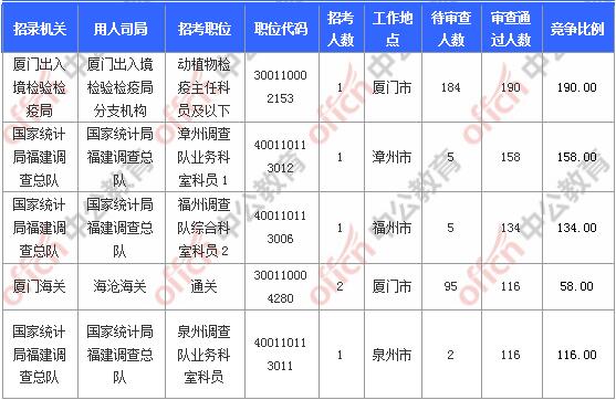 截止到1日16時(shí),競爭比例的職位為廈門出入境檢驗(yàn)檢疫局廈門出入境檢驗(yàn)檢疫局分支機(jī)構(gòu)動植物檢疫主任科員及以下300110002153一職,招錄1人,截止到2日9時(shí)通過人數(shù)為190人,競爭比例190:1!