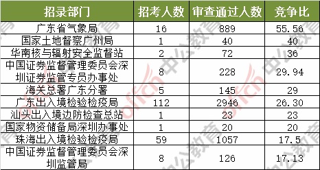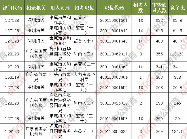 報(bào)名通過(guò)審核人數(shù)前十的職位主要集中在深圳海關(guān)、廣東省國(guó)家稅務(wù)局、廣東省氣象局等部門,具體信息如下: